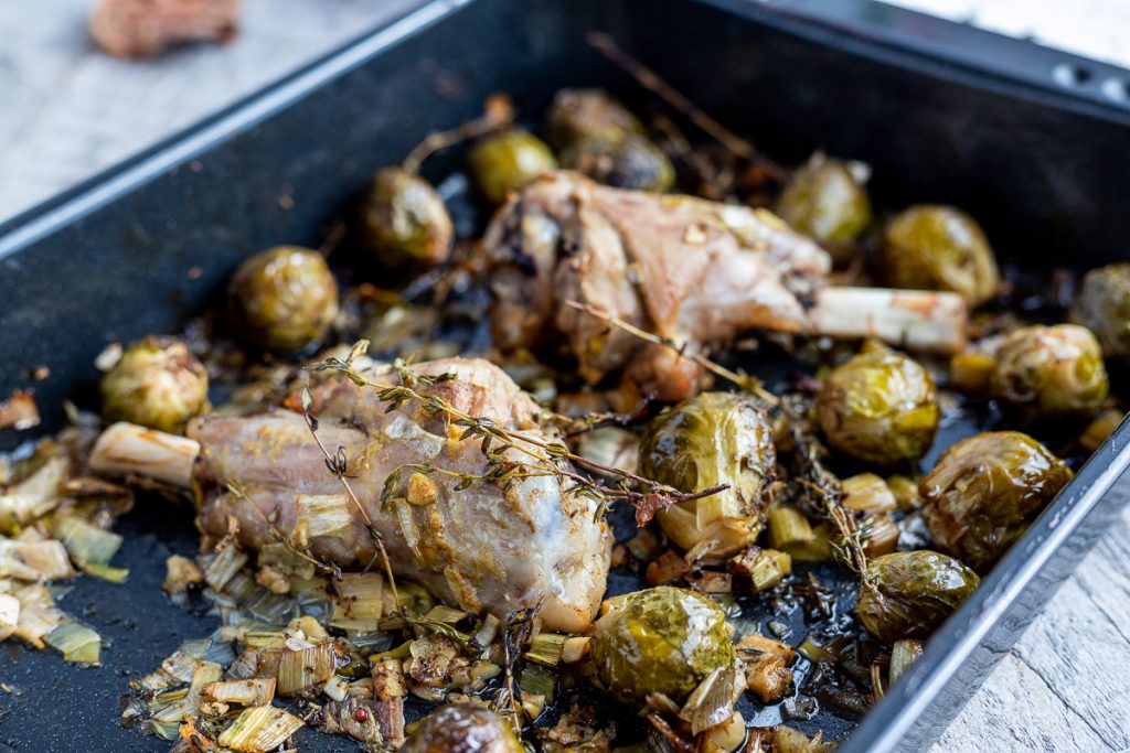 - Während die Kartoffeln kochen die Keulen vorbereiten. Heize zuerst das Backrohr auf 170 °C Unter- &Oberhitze vor. Die Keulen vom Ziegenkitz mit reichlich Dijon Senf einmassieren und dann in einer Auflaufformverteilen. Die Kohlsprossen waschen und um den Keulen auslegen.