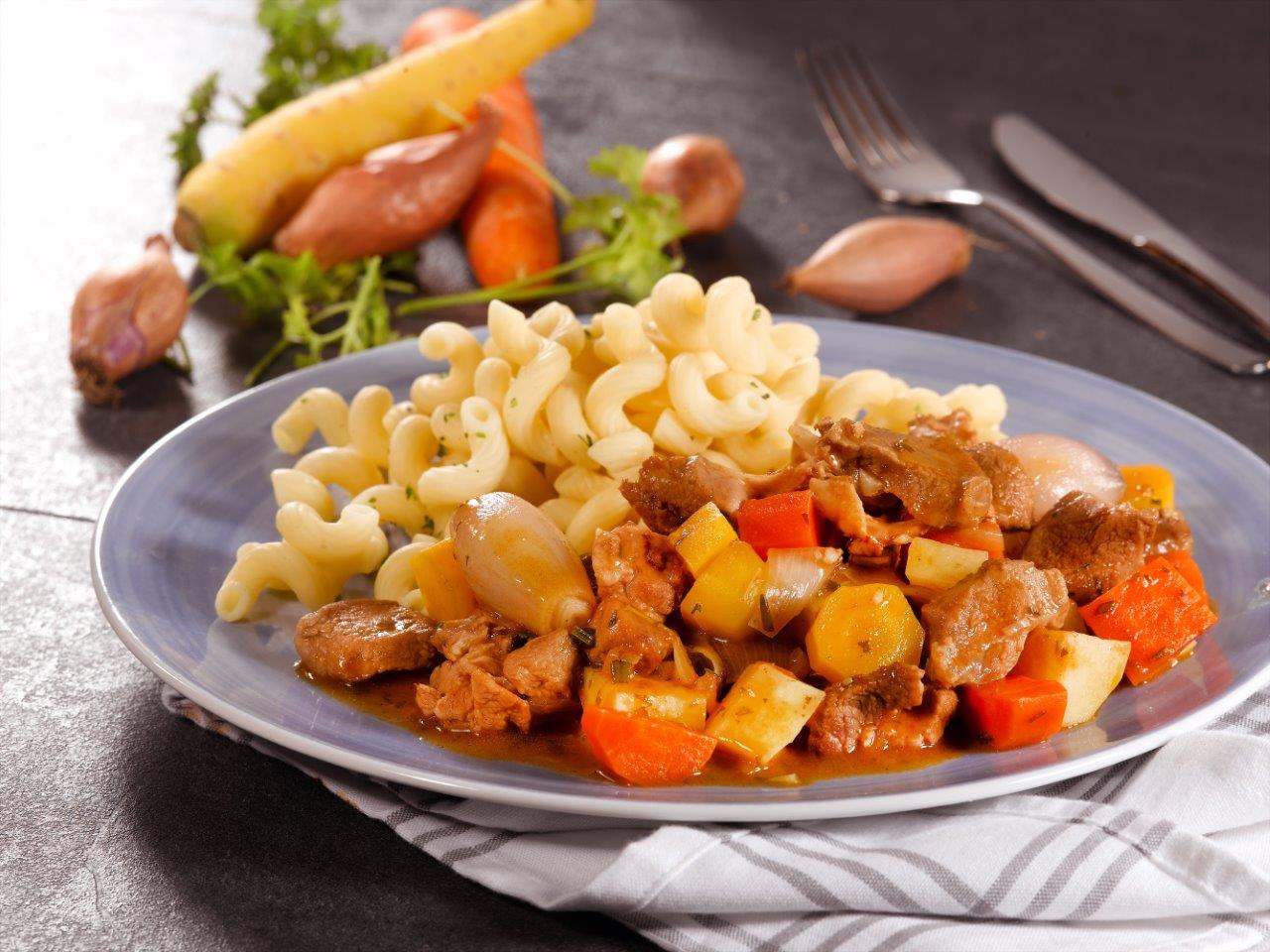 - Gedünstetes Gemüse zum Ragout geben und abschmecken.