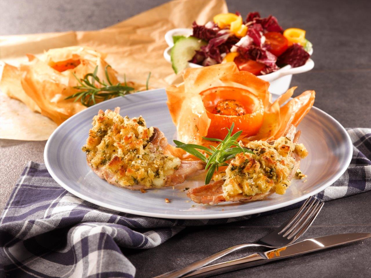 Überbackene Kotletts vom Kitz mit pikanten Strudelsäcken